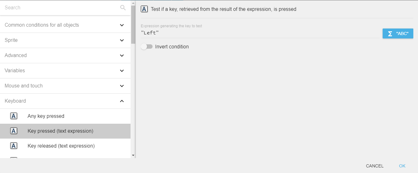 The Any key pressed and Any key released conditions are true when any key on the keyboard is currently pressed or has just been released. These are useful for "press any key to continue" screens.