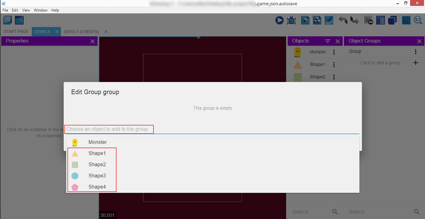 Now all the four shapes are visible in the "Objects" list in the right panel. We will group them with the "Objects" groups editor - click on the fourth icon in the top right menu, the one that have three cubes on it.